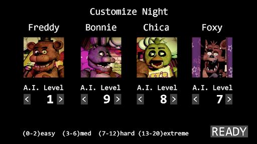 Summer vacation is coming. What kind of part-time job are you planning to do during your this summer vacation? If you have no idea for now, this game might give you some ideas about it. In this summer, you would work as a security guard at Freddy Fazbear's Pizza, a lot of parents and kids like to come here to enjoy food and all kinds of entertainment. Here, the main attraction is Freddy Fazbear and his two friends. As robots, they are programmed to please the crowds and make them laugh. The robots are normal during the day and just carry out all kinds of instructions without any fault. But their behavior has become somewhat unpredictable at night. And it was much cheaper to hire you as a security guard than to find a repairman. So from your small office you must watch the security cameras carefully. No one can predict what might happen for the next minute. So you must put all of your concentration on the security camera all the time. Besides, you have a very limited amount of electricity that you are allowed to use per night. That means when you run out of power for the night, there would be no more security doors and no more lights! If something is not right, namely if Freddybear or his friends are not in their proper places, you must find them on the monitors and protect yourself if needed! There is also a nightmare mode for you to try. Even if it is a little bit scary, actually, the whole experience is wonderful!