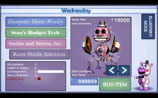 Browse our catalogs and purchase your first attractions and animatronics, customize your decorations, and above all make sure that all the equipment is working properly before opening the doors of your brand new Freddy Fazbear's Pizzeria!