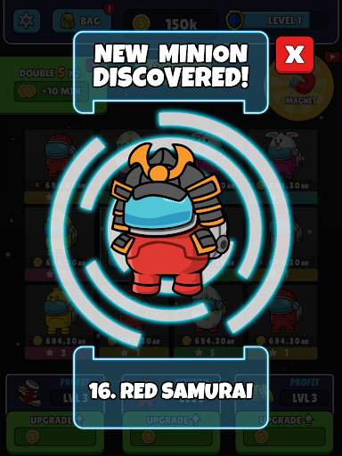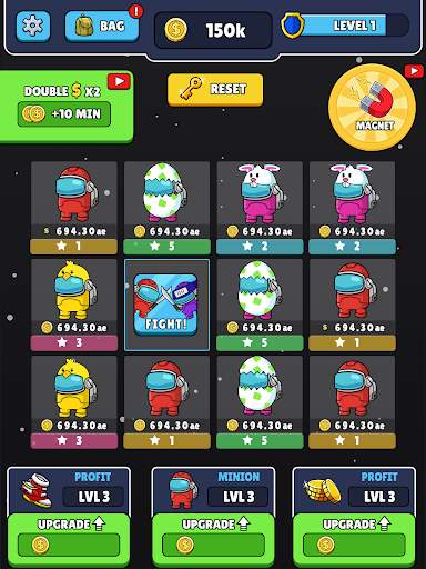 Merge imposters to earn XP, coins, and level up! The higher your level is, the faster you detect a new imposter evolution. Want to play 2X faster? Start from the beginning by kicking all the traitors from the spaceship!
