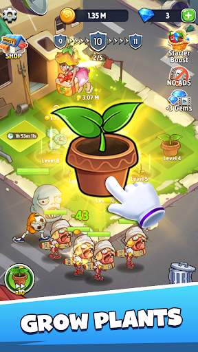 Are you a staunch fun of Plants vs Zombies. If your answer is yes, then you should try this game. You will have a lot of fun. And you will find that it is so easy for you to become addicted to this game. Your main goal in this game is rather simple. You just need to defend your lovely garden. Once you enter into the game, you will notice that a bunch of vicious zombies are about to destroy your lovely garden, so you must be fully prepared by planting a variety of plants. More importantly, you must upgrade your plants on a regular basis to make them become more and more powerful. But you will enjoy the whole process a lot because you will always expect new plants. And it feels so great to have new plants to deal with those monsters. You will feel so proud of yourself every time when your plants just become more stronger and more powerful. It feels so nice to watch your plants shooting out powerful weapons. But at the same time, if you are a careful player, the first thing you will those plants are just so cute when they are spewing out bullets. And you would willingly help those cute plants win the final victory. But it is not an easy fight. So you should fully focus on your mission. To be honest, it is not that kind of easy for you to defend your garden and fight against those hilarious monsters. And you must admit that sometimes the monsters are just more powerful and stronger than your plants. So it is for certain that in some level, your garden will be intruded by those monsters. But you can always start all over again. Actually, if you observe carefully and attentively, you will find out that some of the monsters are so cute in a weird way, especially when they are moving towards your garden. So you will have a rather wonderful gaming experience while you are finishing your mission of destroying those zombies. As for the game play, it is rather simple. You just need to merge the same plants together, and you will have a new plant. There is no need for you to do anything because the plants will fight automatically. And it is so nice to have your own fighting squad composed of plants. And you will feel so happy every time when you unlock a new plant. But you should know that the zombies in this game are really powerful. It is really hard to wipe out all of them in each level. So you need to try your best to take down all of these zombies before they attack your beautiful garden. To achieve this goal, you must be a wise leader. You cannot just blindly send your lovely plants to fight against those monsters without any plan beforehand. So although these monsters are really powerful, especially those big bosses are so hard to deal with, there is still hope. You can devise some strategy beforehand. For example, you can try to use some gems to help the plants shoot out weapons at a faster speed; or you can use some gems to make the plants drop down more quickly, in this way, you can speed up your planting time. As long as you have strong enough plants, you will notice that those monsters just become so vulnerable all of a sudden. But if you want to win the final victory, you need to do some mentality work. You see that at the beginning of each level, there are just a massive array of zombies rushing toward your home. So you must keep calm, no matter how strong or how fast the zombies are. You just need to concentrate. Of course, the zombies will never show you mercy. And they will never give up until they get into your house. So you should be more persistent than the vicious monsters and hang on as long as you could. If you can, you must grow seeds as fast as you could. There is just no time for you to waste. Generally speaking, as an idle merging game, this game is really creative compared with other similar merging games. It actually combines merging and fighting together. So you will have both the fun of merging and fighting at the same time. And as for the skills, there is nothing complicated. If you have relative experience of playing merging games, this game will be a piece of cake in terms of skills. The amazing thing is that you will get rich bonus, even while you are sleeping. So every time when you enter into this game, you will get new surprises and you will find that you just have more gems and more seeds. But these things are just given to you as gifts, eventually you need to depend on yourself to get more gems and gold coins. The thing is that not all the plots are available at the beginning of the game. It will take you several hours to unlock all the plots. So you can see that some of the plots are locked at the beginning of the game, which means you must be patient and unlock them one by one. But there is no need for you to worry about this, because you will eventually unlock all the plots by using either gems or coins. And you will definitely enjoy yourself a lot by merging those cute plants at the same level to create a new powerful plant to fight for you on your new plot. Under the normal circumstances, if you get in touch with such a game, it seems that the whole game mechanics is just repetitive. Players usually get bored with such kind of repetitive merging games within several minutes. Maybe at the first sight, they are interested in the merging objects. But before long, they just get tired of merging. But this game will never let you feel bored or monotonous even if you keep merging your plants. But you must remember that your ultimate goal is not to merge those plans, your ultimate goal is to use some tactics to remove those zombies. So it is time for you to try this creative merging and fighting game. You will have a really exciting adventure with your cute plants. With your existence, there is no way for those zombies to reach the finishing line, let alone invade your home!